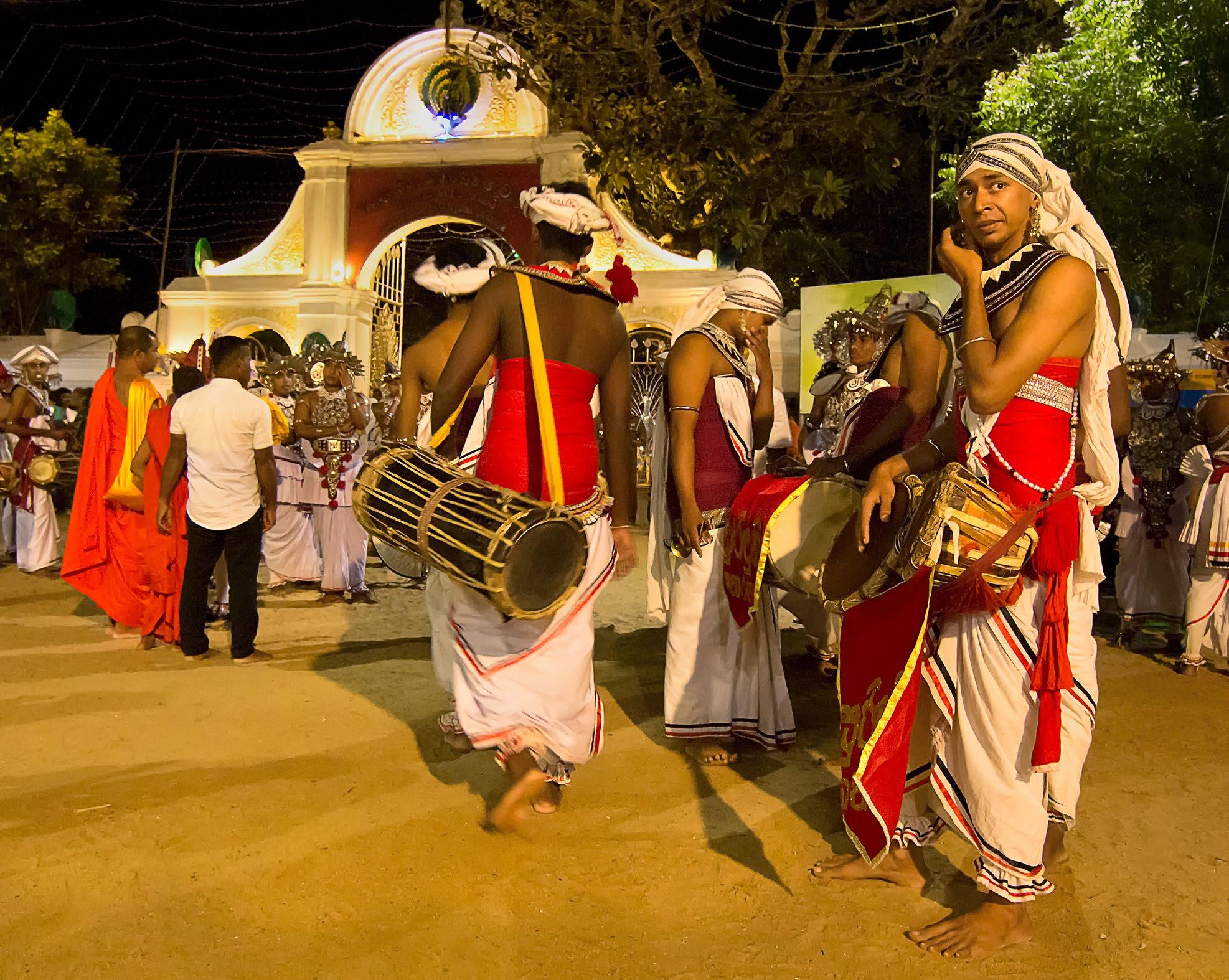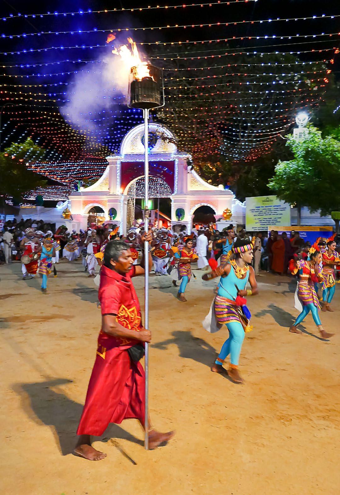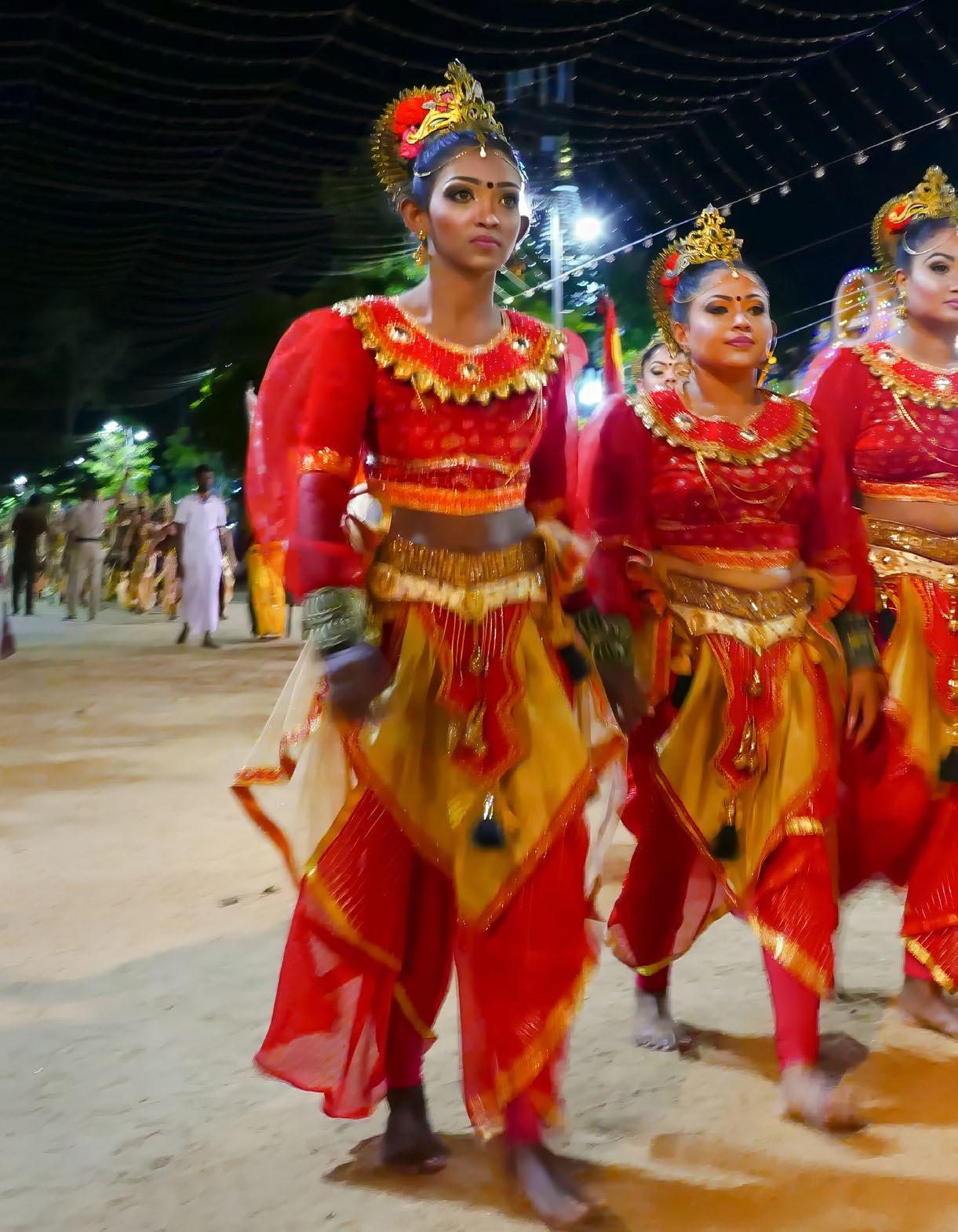 The grand procession commences at the main gated arch entrance to the Ruhunu Maha Kataragama Dewalaya temple. There is much band music and percussion as the procession participants come out through the arch, dancing in the most elaborate costumes. Calling it ‘dancing’ is underselling what they actually do. The whole procession takes a sharp left turn once out through the arch, followed soon after by a right turn then goes down a parallel roadway for 200 m. After some considerable time, when you think it’s all over, the procession returns up the wide, grand avenue leading to the temple, and you can see it all again.