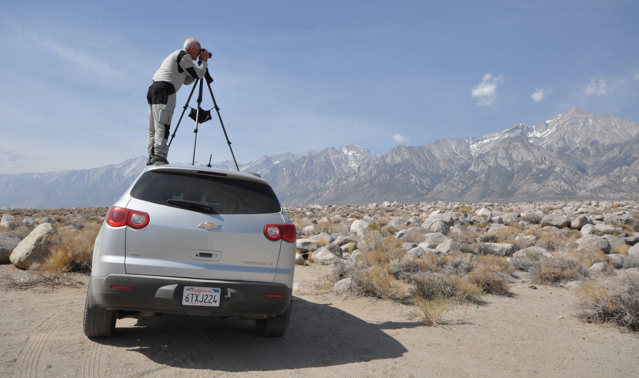 Fig. 11: Emulating Ansell Adams, Robin climbs on top of the car, for a photograph of Mount Williamson.
