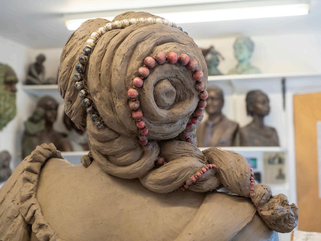 And rather than try to fashion each piece of jewellery and other details, real beads were embedded and strips of lace pressed onto the clay to give the patterning on her dress.