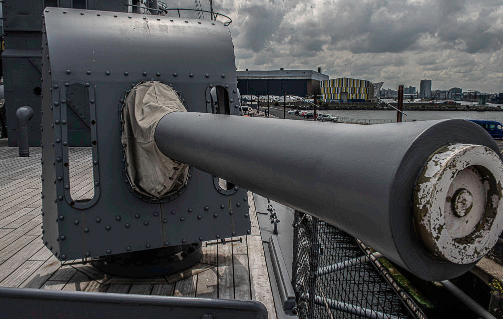 Port Forward Gun - Gunner’s View. HMS Caroline carried 4 x 6 inch guns (and 2 x 3 inch anti-aircraft guns)
