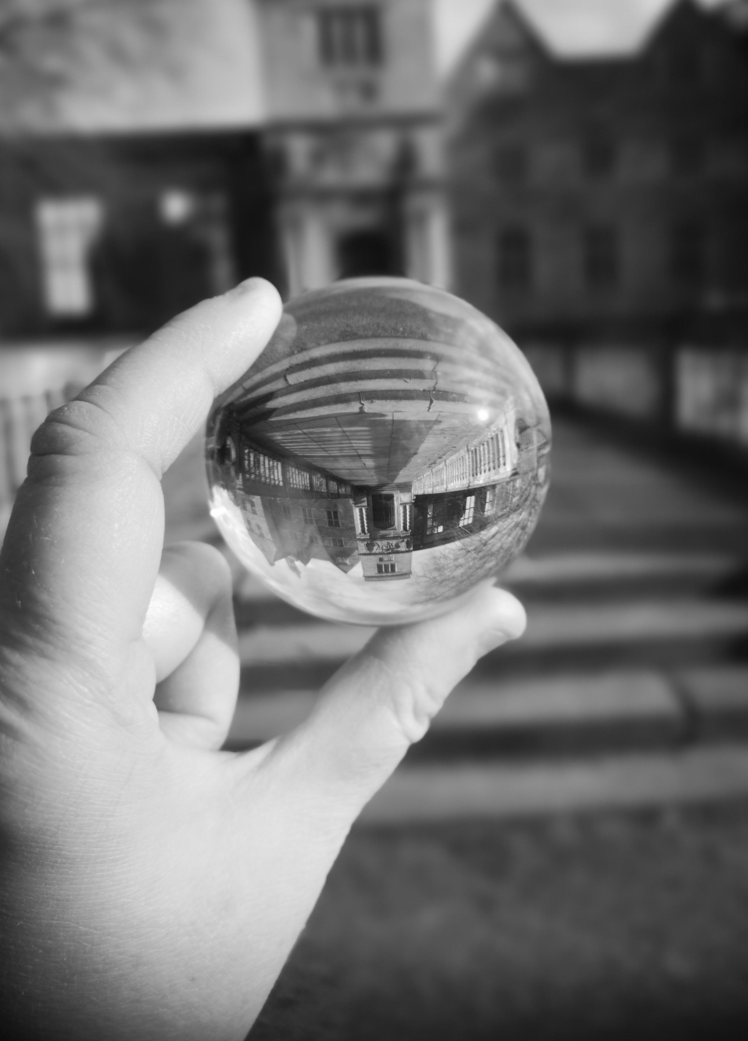 This image captures Rufford Abbey in Nottinghamshire in February 2022. The Lens Ball has captured it through its optics and flipped it upside down. A different way of capturing and seeing local heritage.