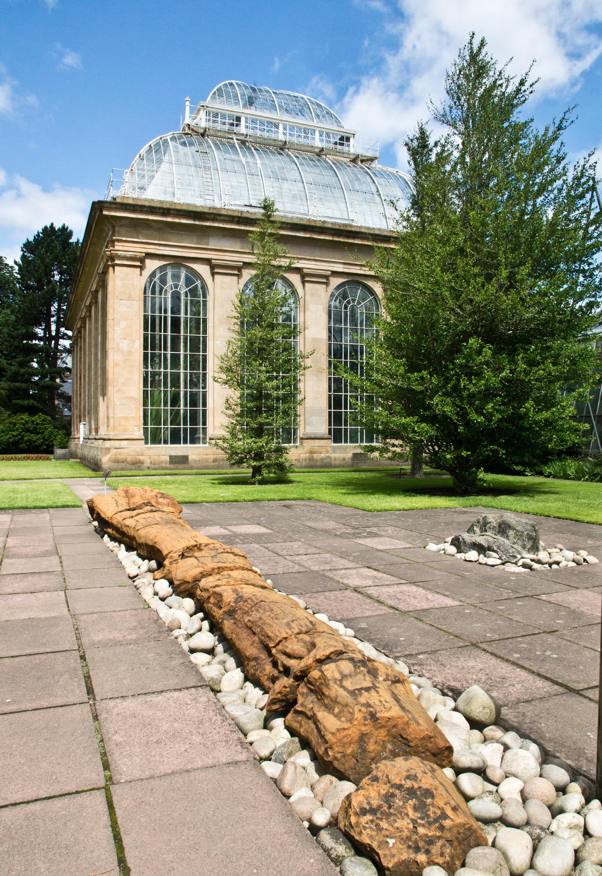20. Victorian Glass House with fossilised tree trunk in foreground, Royal Botanic Gardens, Edinburgh.