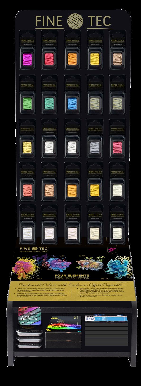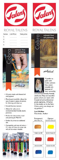 Come double-sided and easily attach to the wooden displays. They feature key selling points about our products, testimonials from our art ambassadors and some have digital color swatches.