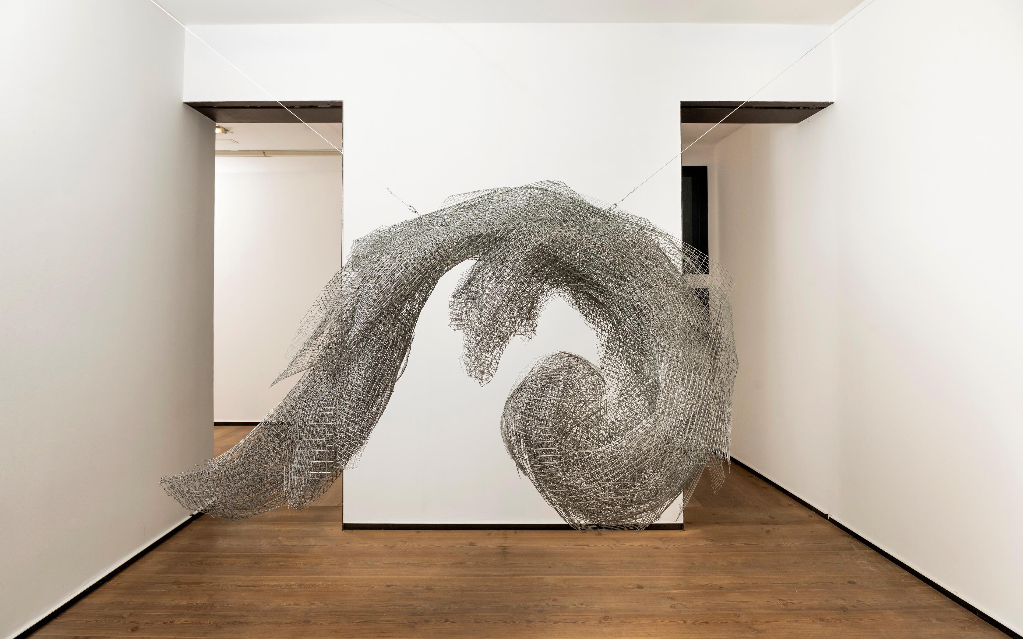 With the aim of exposing the fragility of aesthetic authority, the exhibition offers a distortion of the canon's ideological devices, reappropriating and challenging its traditional formats. The library, understood as a system of organization, is presented as shattered to pieces, alluding to the fragmentation of legitimized forms of knowledge. The portrait, a normative representation of a specific individuality, is constructed here through the accretion of art magazines, diluting the notion of uniqueness into a collective identity a portrait of portraits. Meanwhile, classical ornament, a symbol of formal grandeur, is revisited in the form of a baroque volute made of wire mesh Typically used as a base or skeletal element for the structure, the mesh now takes centre stage, creating a contrast between the "nobility of the material" and the intention to adorn with an inappropriate material The form remains, but the material betrays it.