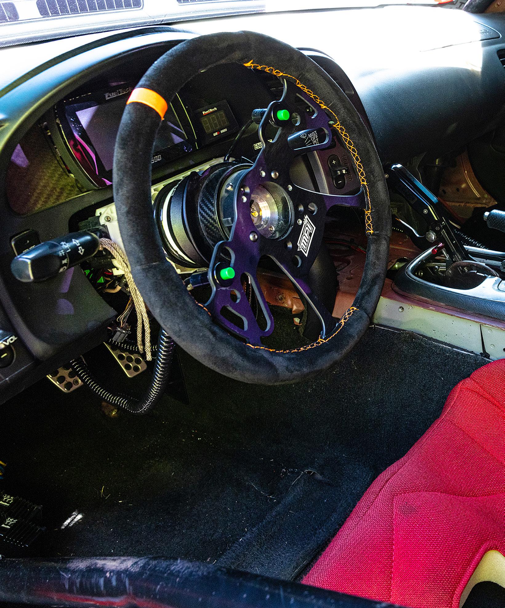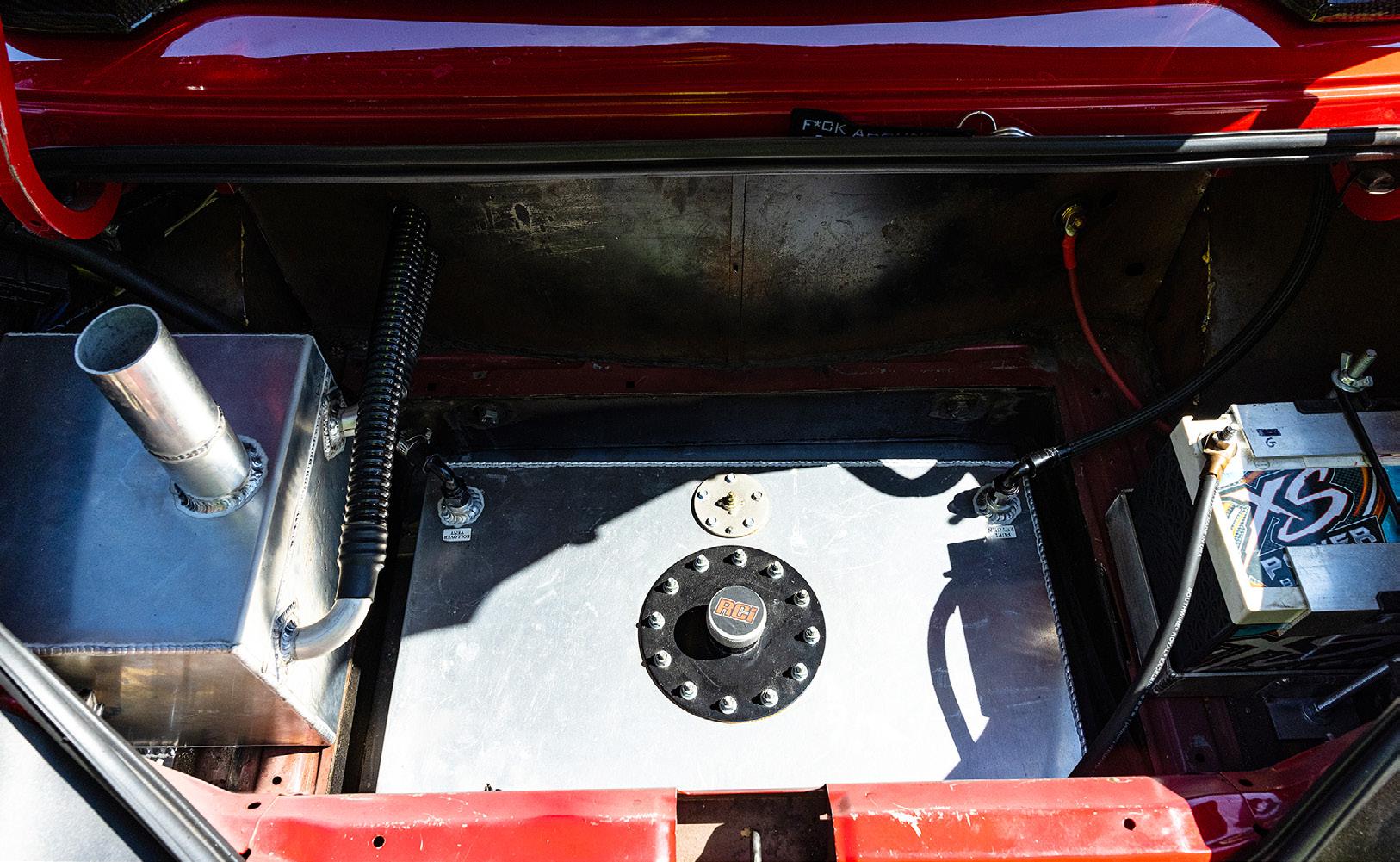 Travis wanted a street car, so all of the interior stayed, including power windows. He sits strapped into a Kirkey seat with RJS harnesses, while a certified cage he built surrounds him. A fuel cell, air-to-water tank, and battery relocation fill up the trunk area.
