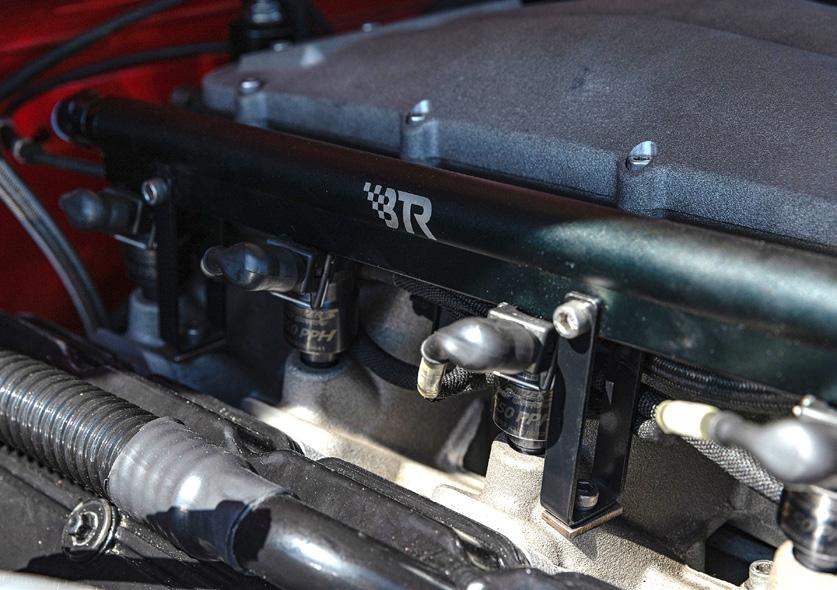 GT55/88mm turbo; Travis built and fabricated the turbo kit himself. Fueling comes via a custom AEI cable drive system that pumps E-85 through Billet Atomizer injectors. A Fueltech stand-alone ECU and dash control all vitals and operations. While there are LS swap kits available, Travis wanted to be able to get the motor in and out fairly quickly with the use