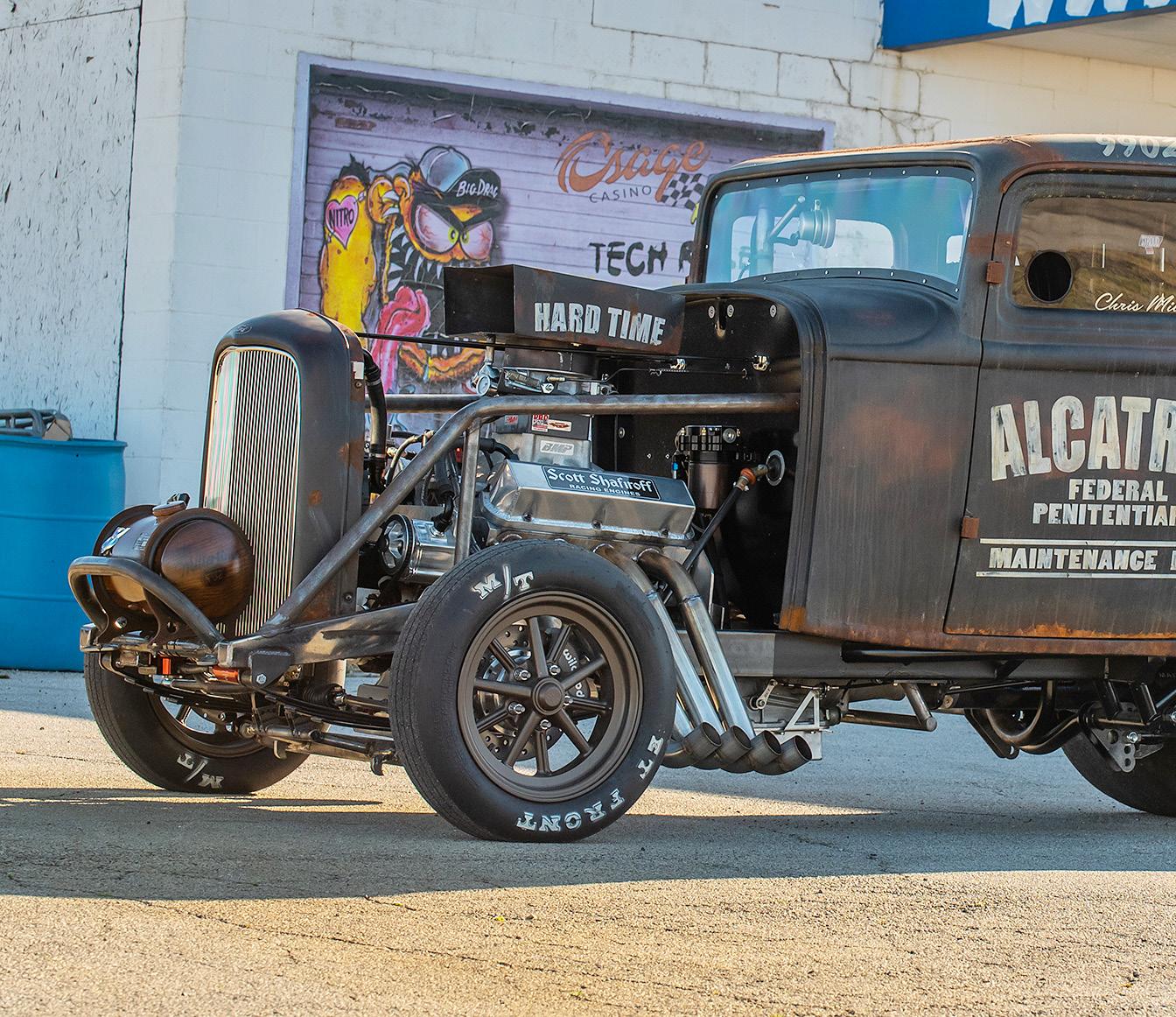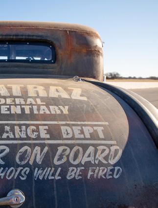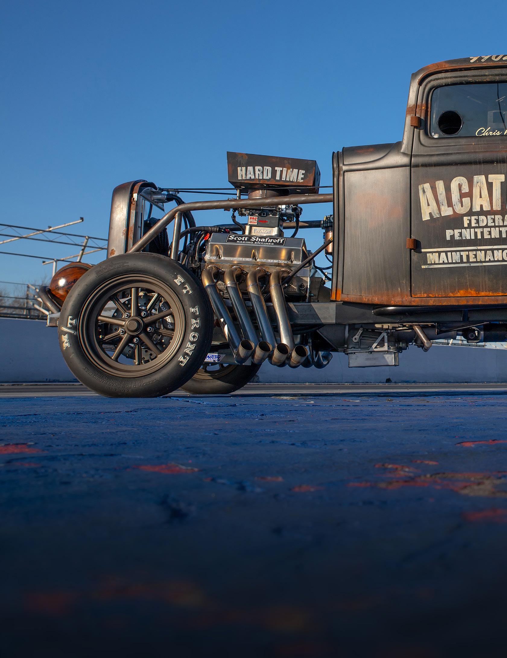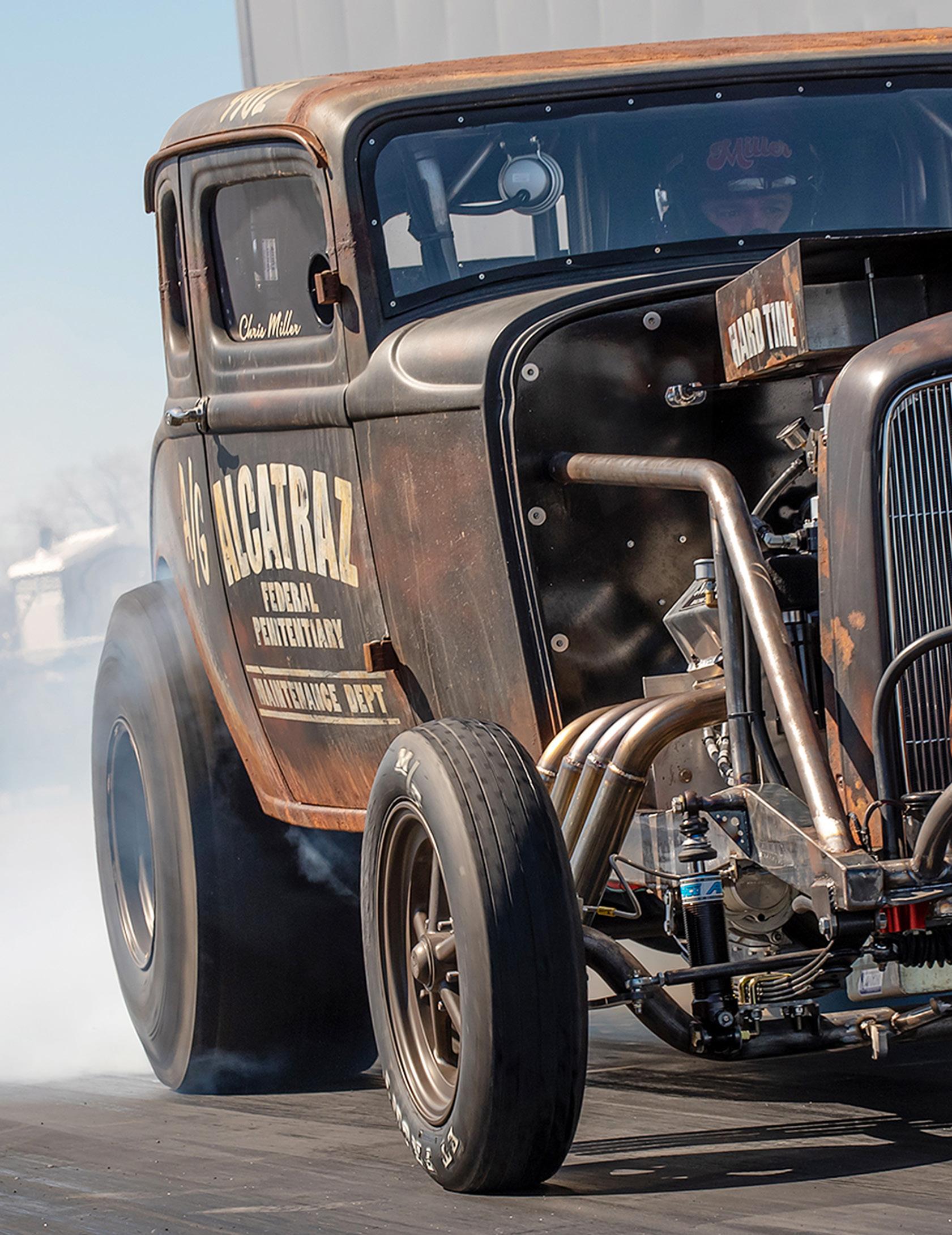 Chris Miller wanted to build an A/G gasser straight axle to represent the forgotten heritage of old school racing like his father did while flag starting drag racing back in the day. The Alcatraz theme came from his enjoyment of drag racing and prison rodeos along with the aura of the now defunct facility itself.