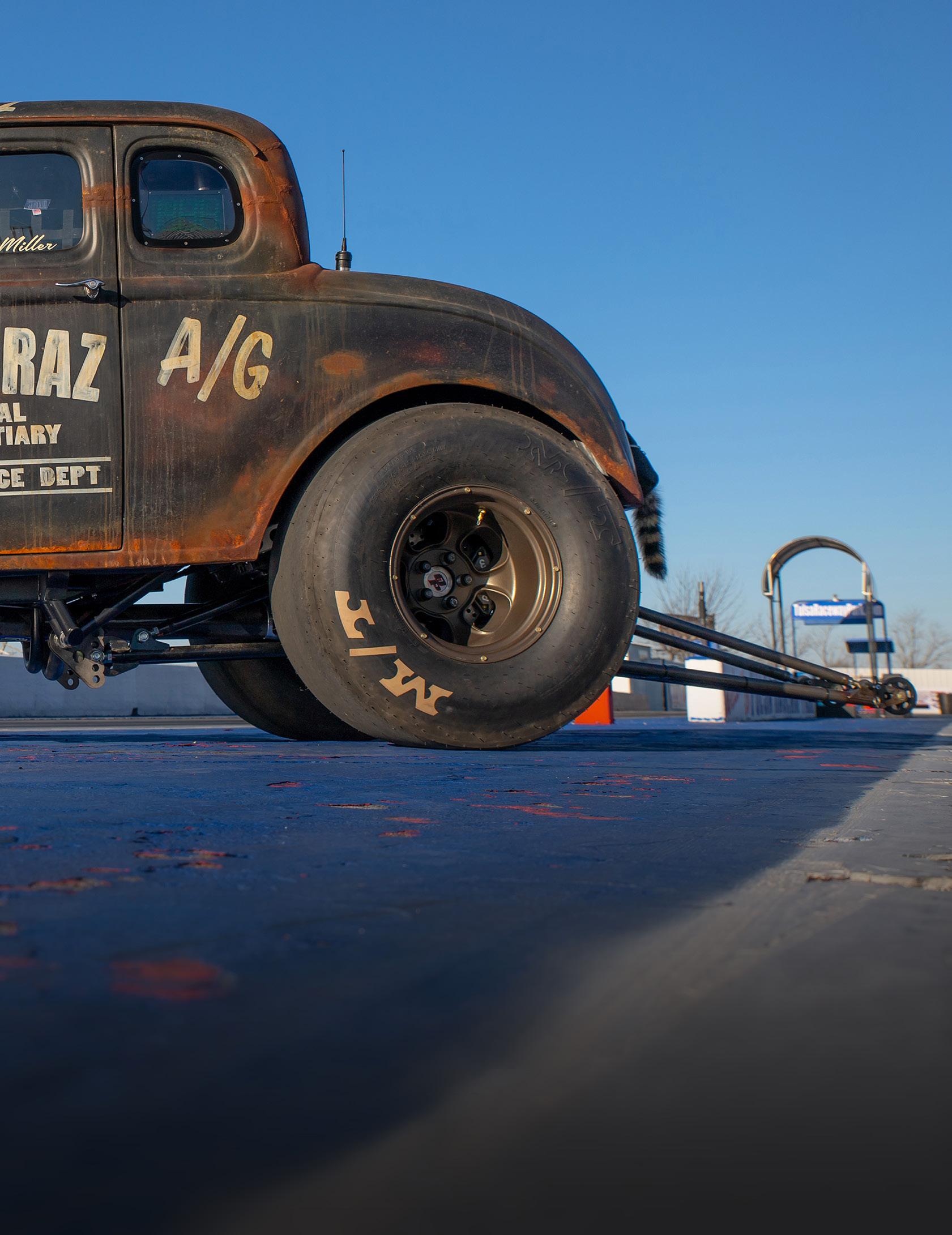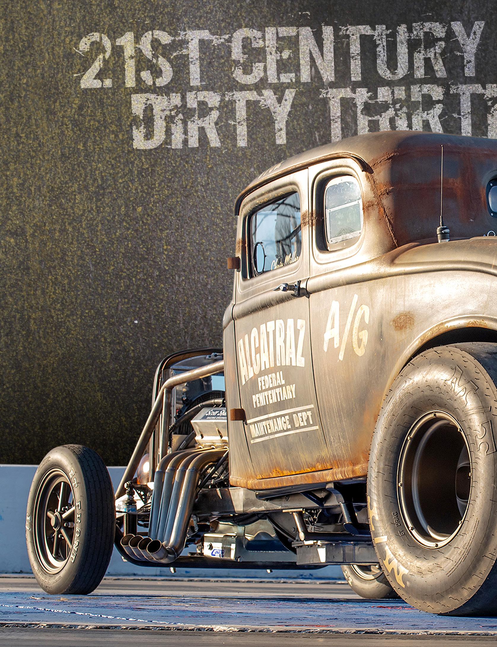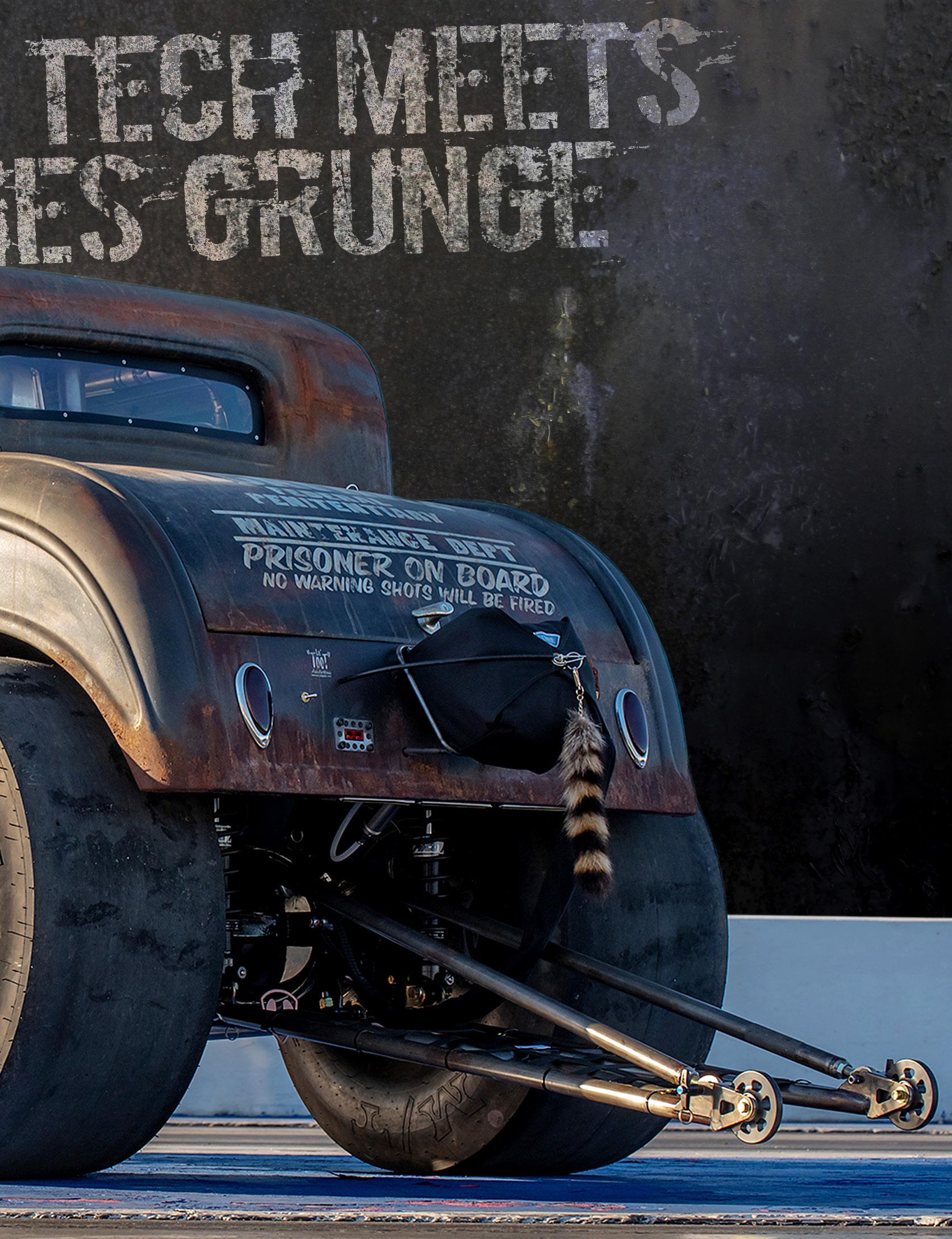 Chris Miller wanted to build an A/G gasser straight axle to represent the forgotten heritage of old school racing like his father did while flag starting drag racing back in the day. The Alcatraz theme came from his enjoyment of drag racing and prison rodeos along with the aura of the now defunct facility itself.