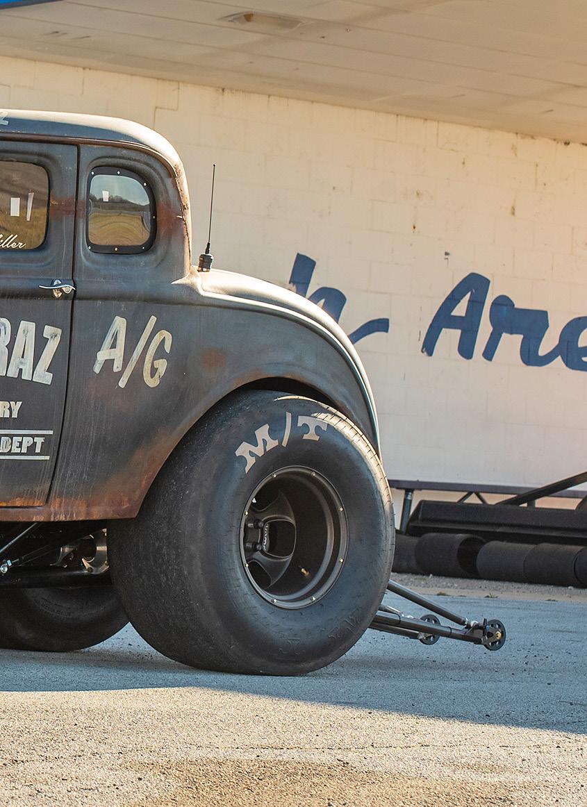 ET wheels custom cut all four – Rear 15” x 14” 5 window wheels, Front 15 x 4 ½ Gasser spoke.