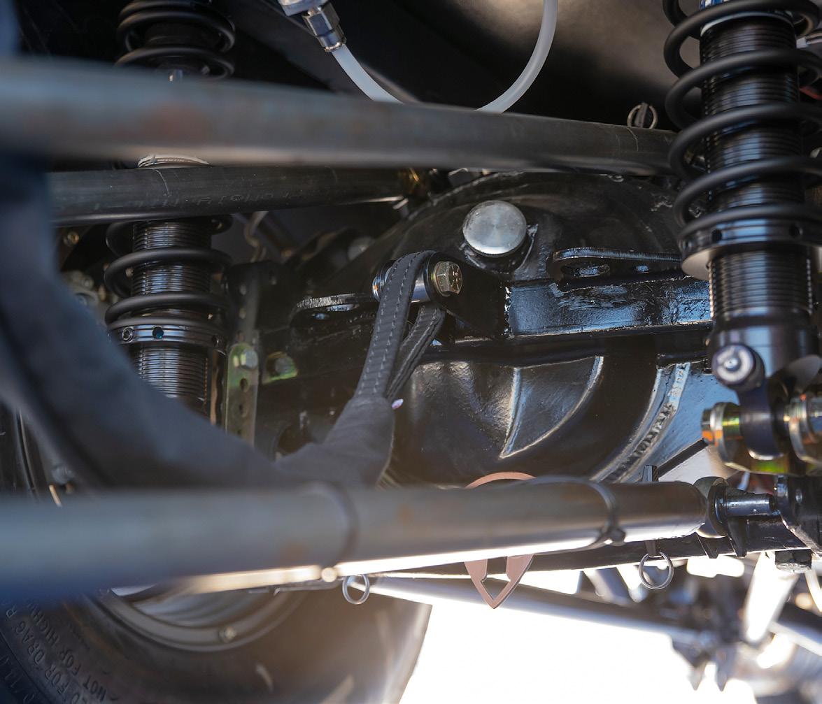 Up front a 6-inch drop straight axle was used with custom leaf springs, Afco adjustable shocks and Flaming River Vega steering box.