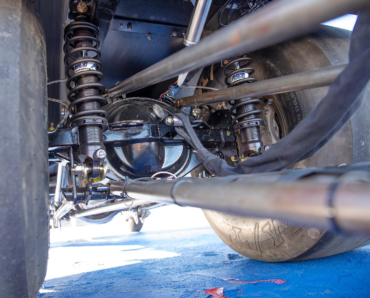 A narrowed and braced 9-inch Ford by Quick Performance is hung by a custom ladder bar rear suspension with panhard bar and double adjustable AFCO coilover shocks.