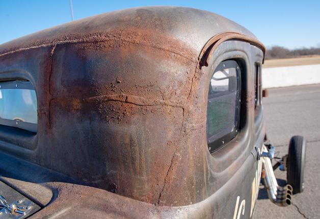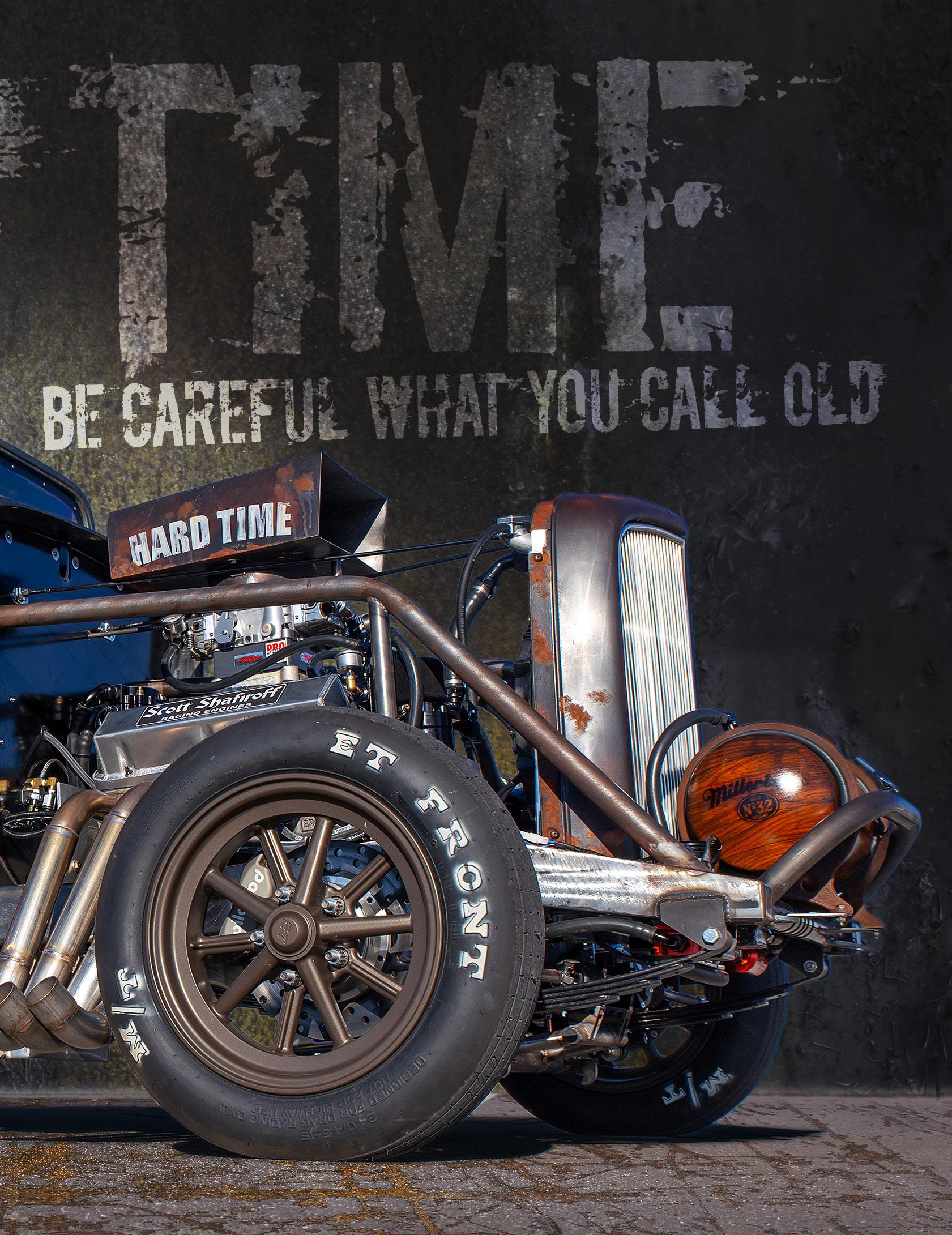 The birth of the “Hard Time” Ford began with a Russ Nomore fiberglass body that was brought to maturity as a straight axle gasser by American Gasser in Saginaw, MI. who completed the chassis, suspension, roll cage and motor placement. Keys Fab Shop in Tahlequeh, OK., added custom detail and fabrication work and Toot’s Autoworks in Tulsa, OK finished the look with custom rustic paint work as if it rolled straight out of Alcatraz. Axalta paint & House of Kolor products were used in conjunction with special techniques and additives (which is a trade secret) to create the worn, weathered and rusty appearance.