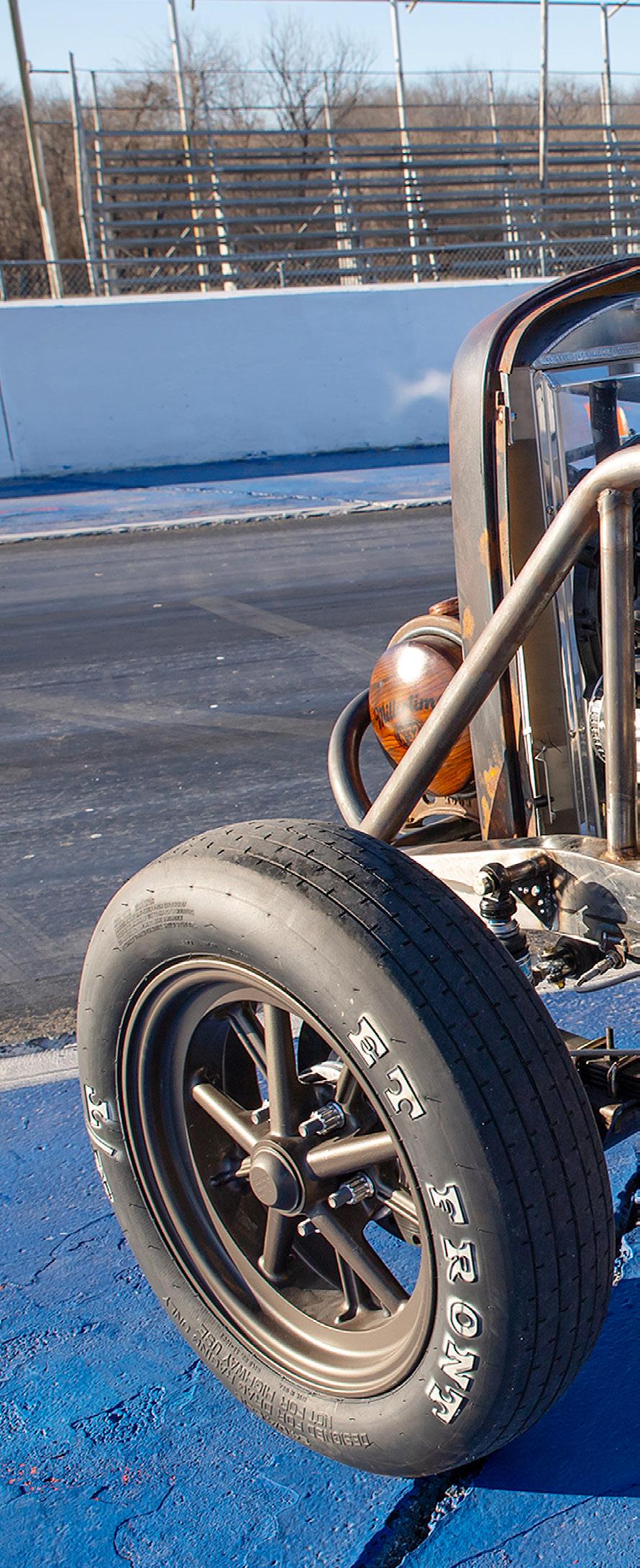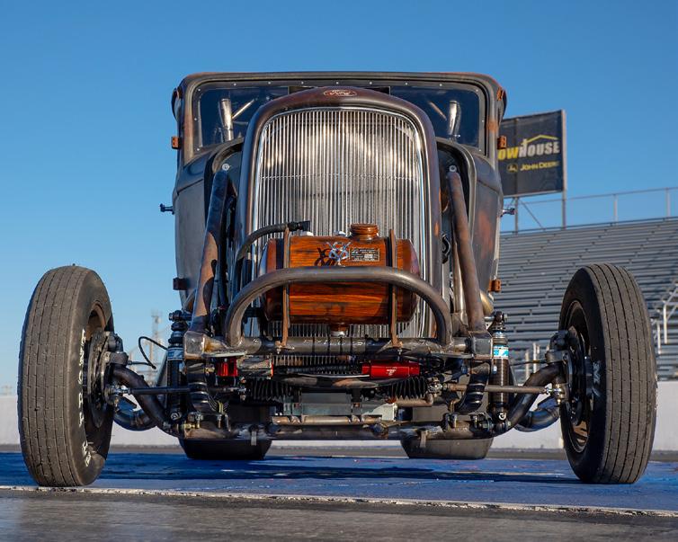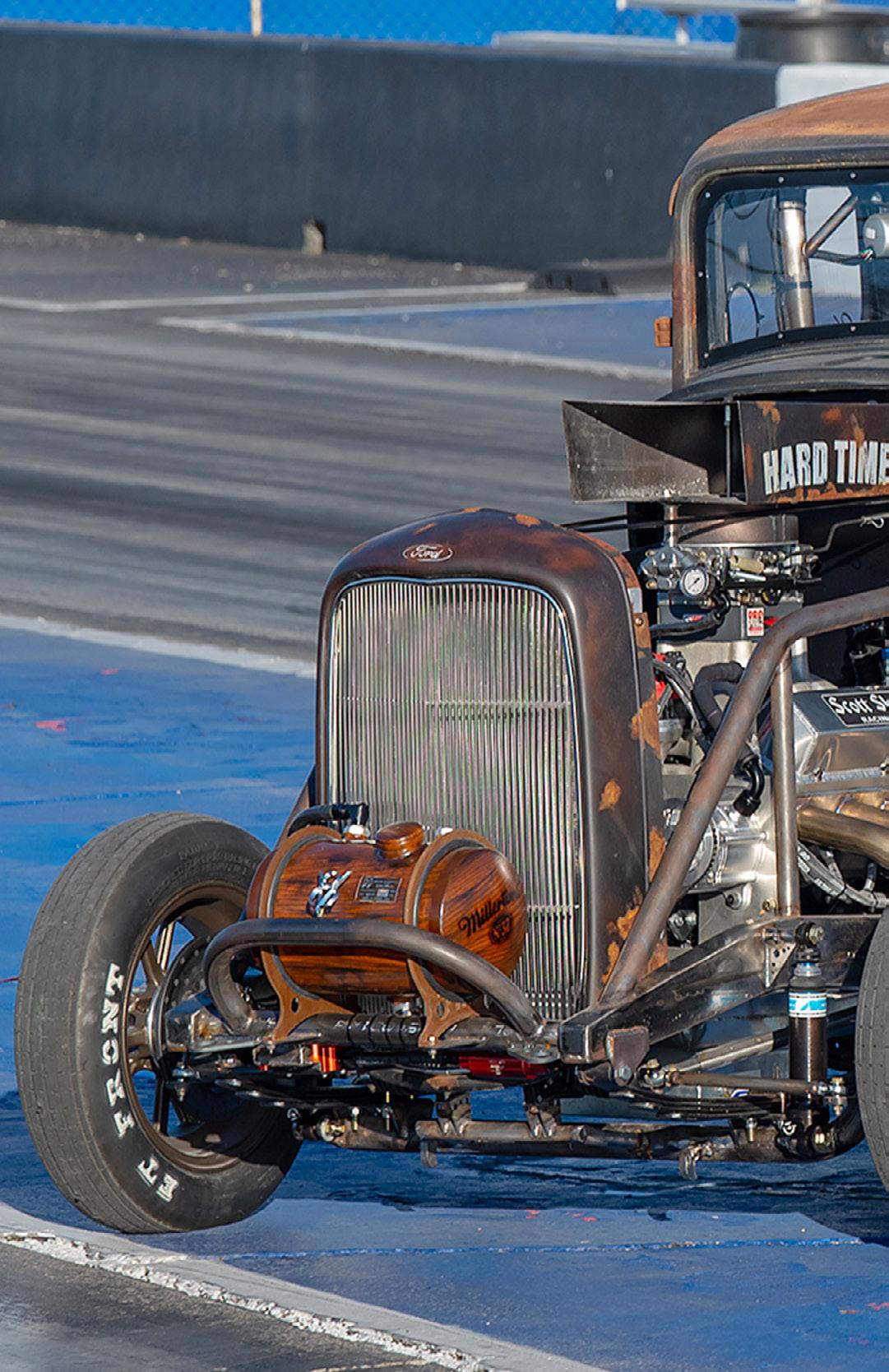 discover an old-school hot rod interest with his own children when he bought a 1923 T-bucket to work on with them. A 1965 Shelby Cobra and Ford 5-Window Coupe would follow which sent him in the direction of X235 radial racing, no-prep drags, index racing, and most recently racing in the Gasser class with the Coupe. RPM readers may recall the Cobra appearing on the front cover of RPM Mag a while back in a giant 4-wheels-off-the-ground wheelstand, however, two years ago a tragic fire destroyed it and it was at that point that Chris threw himself into the build of the ’32 Ford.