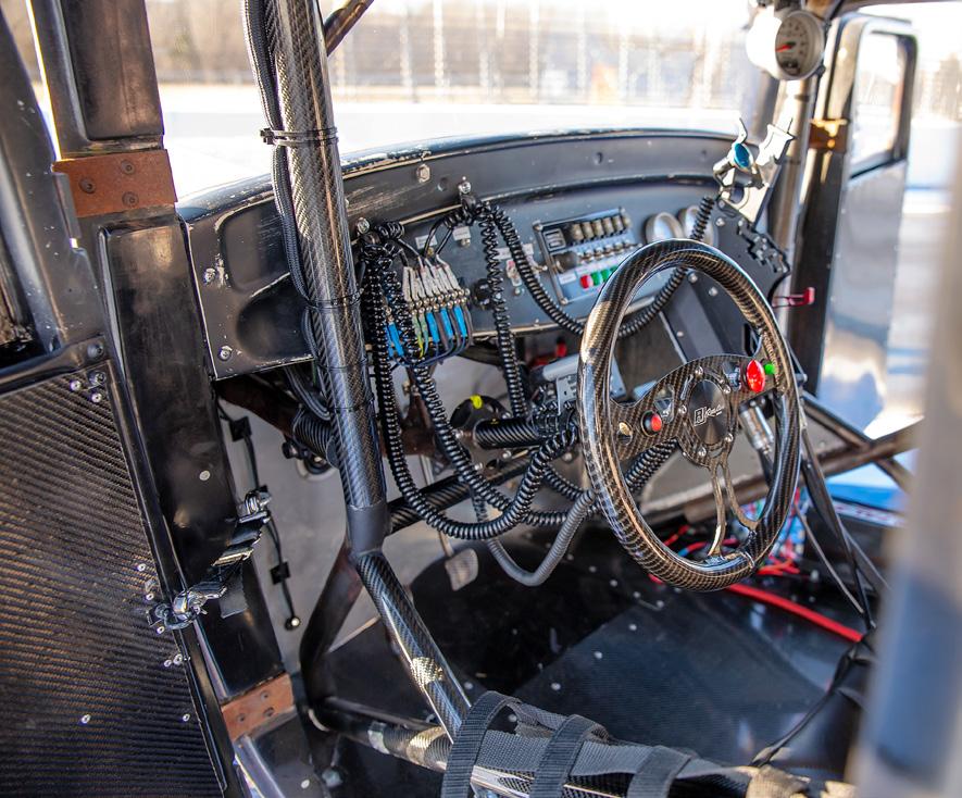 Inside the Coupe, the ragged theme pretty much ends with a complete carbon fiber dash given the appearance to look old and weathered. Carbon door panels, wheel tubs, floor, steering wheel and parachute handle along with custom gauges and billet shifter take the car’s vibe to a modern high tech level.
