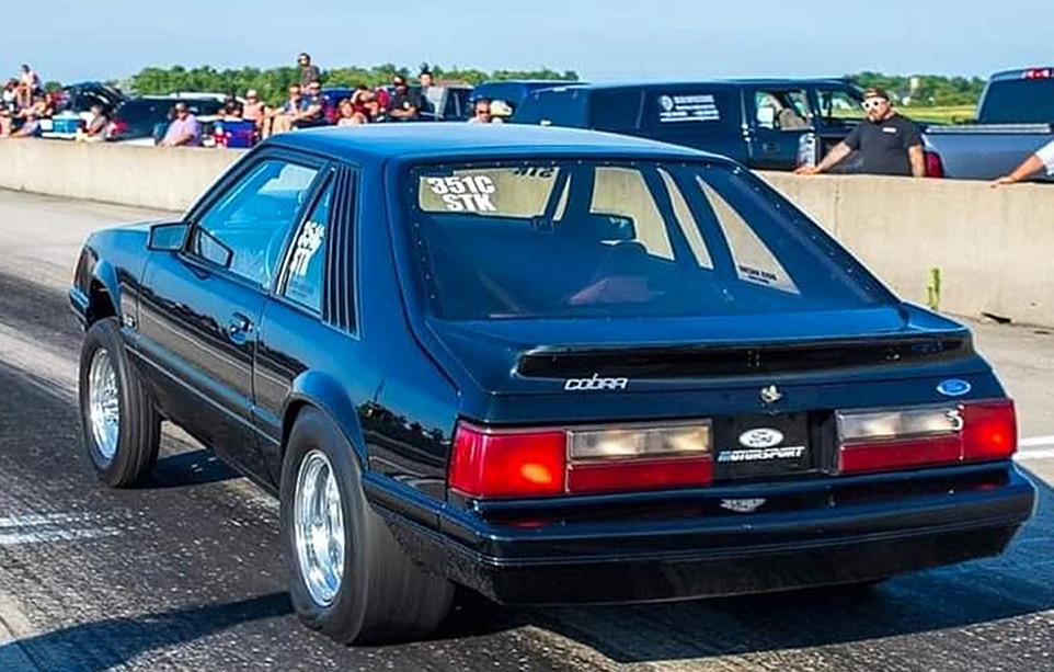 october Brad Hager & Braeden Hager’s Stick Shifted No-Prep 1986 Ford Mustang LX Body & Paint: The car has an all original factory steel body including the hood. Paint and Body work was performed by Stacy Cromwell of Cars and Trucks (CT) Collision in Brantford, Ont. Multiple coats of sin gle stage black Urethane with a hint of “extra black“ Chassis & Suspension Modifications: Car is mini tubbed with coilover/ladder bar rear allowing for a max tire size of 31x13. Chromoly 10 point rollcage with 8.50 cert. Currently run a 28 x 10.5 non W. Front suspension has QA1 K-member and A-arms with 10 way adjustable coilover shocks and adjustable caster camber plates. Flaming River rack and pin ion. Engine: The block is a vintage Australian 4 bolt main iron EX-192540 which was also sold through Ford Motorsport. Block has Hank The Crank external oiling system and external oil pump system. The engine is 358 ci and was dynoed at 754 HP @ 8200 rpm N/A. Boss Racing custom grind cam spec manufactured by Comp Cams. Rotating Assembly: Bryant billet steel crank 3.500 stroke with Groden 6” alum rods. Custom JE pistons with in-house hand shaped domes. Cylinder Heads: Factory produced Ford 1971 D1 closed chamber 4V heads with out high port exhaust plates. 2.19” 1.71” Xceldyne Titanium valves with BOSS custom valve and seat angles. Heads flowed on Superflow 1020 at 378cfm Intake and 248cfm Exhaust @ .750 lift. In-house ported. Rockers are stud mount Crane Gold Race 1.73 ratio with PAC dual valve springs and vintage Jomar stud girdle. Push rods are 3/8” Comp cams .080” wall. Induction & Fuel Delivery: Thumper 1050 billet Dominator carb with custom fabricated hand ported cast single plane intake manifold. Mannafuel Pro star 500 fuel pump with 4 port regulator. Electronics: MSD Digital 6 ignition box with crank trigger and MSD Pro Billet distributor. Power Adder: Naturally Aspirated Transmission: Doug Nash 5 speed Pro Shifted with 157 tooth Ford Racing steel billet flywheel. Diaphragm Spec Stage 1 clutch with Lakewood scattershield. Rear Differential: Custom braced Ford 9” with 40 spline axles and aluminum Moser 3rd member with 5.14 gears. Brakes: Aerospace rear disc brakes / Wilwood front disc brakes. Tires & Wheels: Weld DragLite fronts 15x4 with M/T front runners and DragLite 15 x10 rears with M/T ET Drag slicks 10.5 non W. Interior: Vintage Ford Motorsport 10,000 rpm tach with Autometer gaug es. RCI racing seats with custom stock appearing covers. Lenard Long inline 5 speed shifter and RCI 5 point safety harness. ET & MPH: No time car. Most Unique Feature(s) About The Car: “This old school cast iron 351 Cleveland engine that dates back to 1970. Some of these motors were campaigned by the Pro 5.0 racers in the early 90s but were quickly dropped for the 351 Windsor engine. In addition to this rare motor we opted to keep a manual transmission behind it to experience a little bit of the old NHRA Modified Eliminator from back in the 70s.”