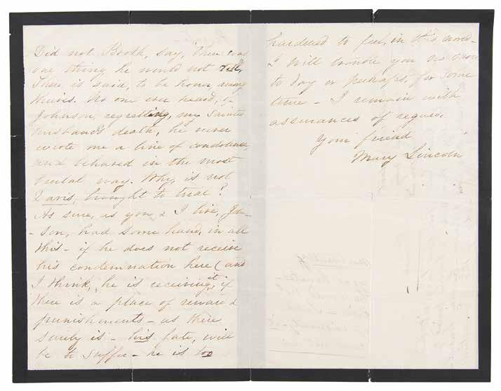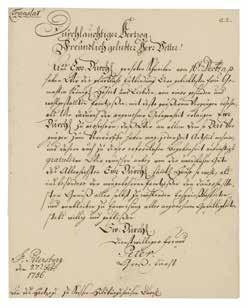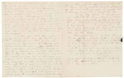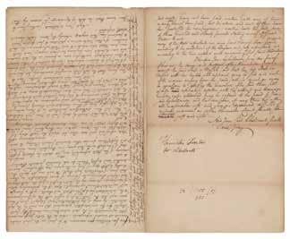16. James Monroe Docketed Letter by Edward Carrington. ALS signed “Ed. Carrington,” one page, 7.25 x 10.5, June 13, 1787. Edward Carrington, a soldier and statesman from Virginia, writes to “Col. James Monroe, Attorney” to inform him of the repayment of a debt owed by the bankrupt Jacob Mordecai, a noteworthy Americanborn Jewish businessman and partner of financier Haym Salomon. Carrington writes, in part: “The eleventh of next month is appointed for the distribution of Mr. Mordecai’s effects. He has made return of your debt, the amount as well as I recollect one hundred & ten pounds. The assignee in whose hands the list of debts is being out of Town, I cannot have recourse to it for greater certainty—it will however be necessary that you make allotment of your debt and make affidavit for the justness of it, to [entitle] you to a dividend, as Mr. Mordecai’s return only presumptively places it on the list. Will you be good enough to do this and forward it immediately to me?” Addressed on the integral leaf to Monroe by Carrington, and franked “Free, Ed. Carrington” at the bottom; docketed in Monroe’s hand, “June 13, 1787, Col. Carrington.” In very good condition, with overall foxing, and adhesive residue stains to the integral address leaf, which also display a repair to seal-related paper loss. Starting Bid $300