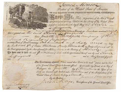Signed as President. Partly-printed vellum DS as president, one page, 11.25 x 8.5, November 4, 1817. Desirable military land grant by which President Monroe, “in pursuance of the Acts of Congress appropriating and granting Land to the Army of the United States,” grants Oliver Leffingwell, “late a private in Butterfield’s Company of the Second Regiment of Infantry,” a 160-acre tract of land in the Territory of Illinois. Nicely signed at the conclusion by President James Monroe and countersigned by Commissioner of the General Land Office Josiah Meigs. The white paper seal affixed to the lower left remains intact. In very good to fine condition, with trimmed edges and scattered soiling. Starting Bid $200