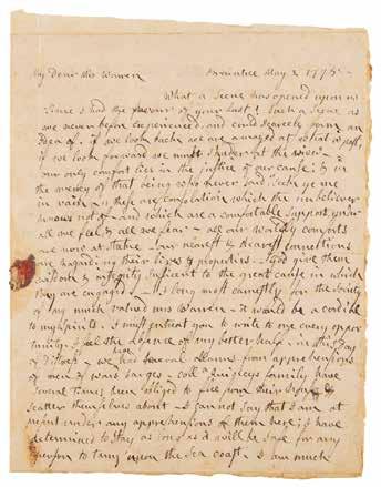 4. Abigail Adams Autograph Letter Signed. ALS, one page both sides, 6.25 x 8, May 2, 1775. Handwritten letter to activist poet and playwright Mercy Otis Warren, voicing her fervent hope for the American cause in the immediate aftermath of the Battles of Lexington and Concord. In full: “What a scene has opened upon us since I had the favour of your last! Such a scene as we never before Experienced, and could scarcely form an Idea of. If we look back we are amazed at what is past, if we look forward we must shudder at the view. Our only comfort lies in the justice of our cause; and in the mercy of that being who never said, ‘Seek ye me in vain.’ These are consolation which the unbeliever knows not of, and which are a comfortable support, under all we feel, and all we fear. All our worldly comforts are now at stake—our nearest and dearest connections are hazarding their lives and properties.—God give them wisdom and integrity sufficient to the great cause in which they are engaged.