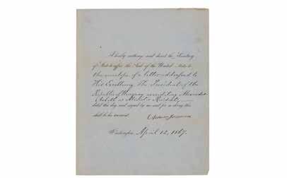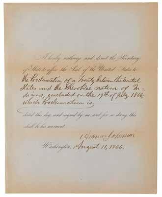 11. President Andrew Johnson Approves a Pact that Abolishes Slavery within the Cherokee Nation. Partlyprinted DS as president, one page, 8 x 10, August 11, 1866. President Johnson directs the Secretary of State to affix the Seal of the United States to “the Proclamation of a Treaty between the United States and the Cherokee Nation of Indians, concluded on the 19th of July, 1866.” Signed crisply at the conclusion by Andrew Johnson. In fine condition, with toning to the edges and folds. Accompanied by a printed engraving of “A New Map of the Cherokee Nation” and by a printed copy of the ‘Treaty with the Cherokee, 1866.’ Starting Bid $200