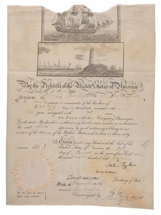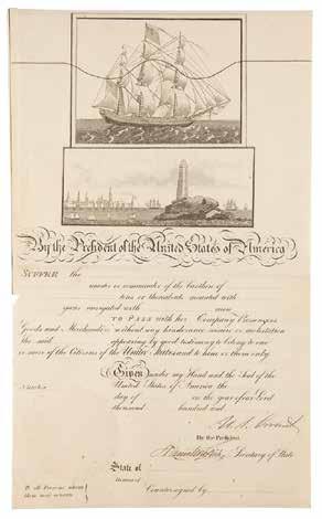 This unusual ship’s pass presents as quite the anomaly. While its unissued nature is not overly uncommon — these documents were often left blank and signed in advance before being sent out to American ports, where they were filled out as needed — the document features a few curious characteristics: the material is paper and not vellum; the upper portion, with a waved ‘trace line’ cutting through the vignette’s sails, is unclipped, and not of the more commonly seen ‘scallop-topped’ variety; and the date of the document, being a post-Civil War example, is very atypical, as no other similar ‘ship’s pass’ in our database dates to later than the early 1850s. A truly unique presidential keepsake. Starting Bid $300