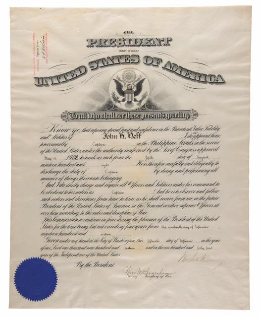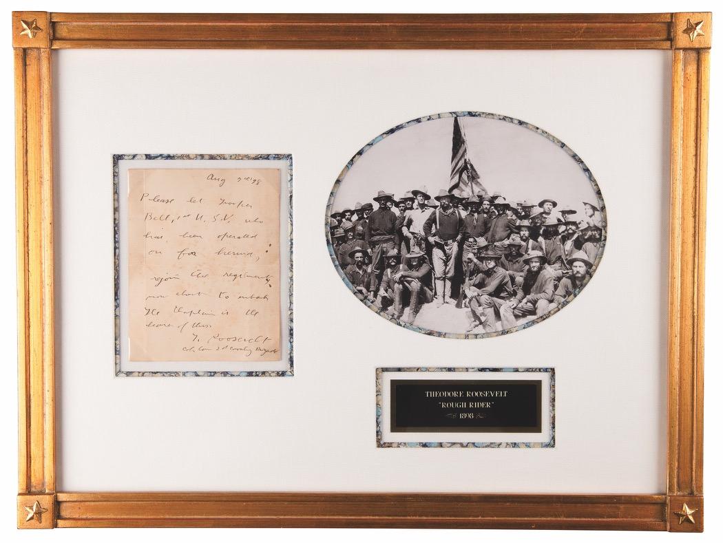 as president, “with the regards of Theodore Roosevelt, Feb. 11th 1908.” Matted and framed to an overall size of 12.75 x 14.75. In very good to fine condition, with dampstaining to the mat and mount, and silvering to the perimeter of the photo. The consignor notes that this portrait originates from the collection of Roger A. Selby, the son of shoe tycoon George D. Selby, who obtained the signature at the Dewey Hotel in Washington, D.C. Accompanied by Roger A. Selby’s personal business card. Starting Bid $300