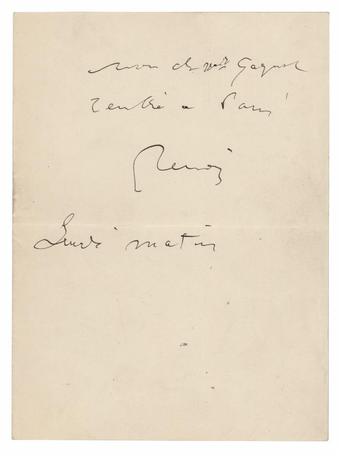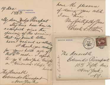 19. Chester A. Arthur Autograph Letter Signed as President. Scarce ALS as president, two pages, 5 x 8, Executive Mansion letterhead, December 19, 1883. Handwritten letter to Judge Edwards Pierrepont, in full: “My time has been so occupied since the opening of the session that my private letters have received no attention. I thank you cordially for your kind note of the 6th inst. I expect to go to New York tonight or tomorrow & hope to have have [sic] the pleasure of seeing you while I am there.” Removably encapsulated in a mylar sleeve. In fine condition, with a complete separation to hinge. Accompanied by the original Executive Mansion mailing envelope, addressed in Arthur’s hand. Pierrepont had briefly served as a reform-minded attorney general in the Grant administration, before being removed and appointed as minister to Great Britain. Starting Bid $200