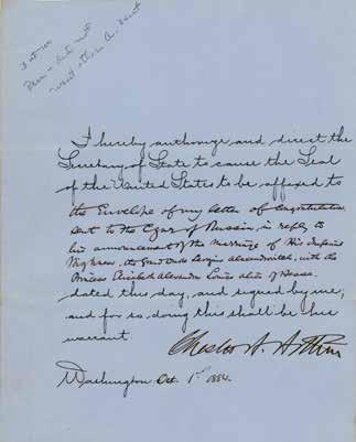 20. President Chester A. Arthur Congratulates Russian Emperor Alexander II on the Marriage of His Son, Grand Duke Sergei Alexandrovich. Partly-printed DS as president, one page, 8 x 10, October 1, 1884. President Arthur directs the Secretary of State to “cause the Seal of the United States to be affixed to the Envelope of my letter of congratulations sent to the Czar of Russia, in reply to his announcement of the marriage of His Imperial Highness, the Grand Duke Sergius Alexandrovitch, with the Princess Elisabeth Alexandra Louise Alice of Hesse.” Signed prominently at the conclusion by Chester A. Arthur. In fine condition, with a light diagonal crease passing through the signature. Starting Bid $200