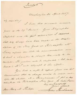 9. James Buchanan Autograph Letter Signed as President on Philadelphia Navy Yard. ALS as president, one page, 7 x 8.75, April 30, 1857. Handwritten letter to Hon. Henry M. Phillips, a Democratic member of the U.S. House of Representatives from Pennsylvania. In full: “I have this moment received yours of the 29th Instant. Your Telegraphic Dispatch was the first intimation I received that any change had been made in the Master Laborer of the Navy Yard at Philadelphia. Mr. Jones informs me that the recommendations were of such a character he thought there could be no mistake. The question will be suspended & both parties heard…You had a right to expect from our last conversation that no changes would be made until after the election. As a Pennsylvanian I feel a deep interest in the Philadelphia Navy Yard.” In fine condition. Starting Bid $200