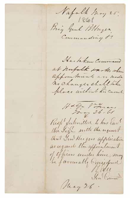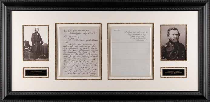 14. U. S. Grant Autograph Letter Signed to President Andrew Johnson, Recommending a Civil War Post Office Agent. ALS signed “U. S. Grant, General,” two pages, 7.75 x 9.75, Head Quarters Armies of the United States letterhead, August 2, 1866. Handwritten letter to “His Excellency A. Johnson, President of the U. States,” in full: “It gives me pleasure to acknowledge the services of Col. A. H. Markland, as special Agt. of the P. O. Dept. throughout the war, for furnishing mails to the Armies in the field with promptness. He was ever vigilant and efficient in the line of duties he was required by his office to perform. These duties, I should think, formed a good lesson preparatory to the performance of higher duties in the P. O. Dept. and I take pleasure in expressing my conviction of the Colonel’s fitness for any position in that department he may seek.” Handsomely mounted, doublematted, and framed with portraits and engraved plaques to an overall size of 41 x 20.5. In fine condition.