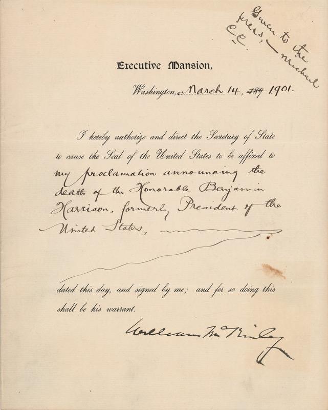 21. Benjamin Harrison Document Signed as President on the Centennial of George Washington’s Inauguration. Partly-printed DS as president, signed “Benj. Harrison,” one page, 8 x 10, April 4, 1889. President Harrison authorizes and directs “the Secretary of State to cause the Seal of the United States to be affixed to my Proclamation of the centennial of Washington’s inauguration.” Signed boldly at the conclusion by Benjamin Harrison.” In fine condition. Starting Bid $200