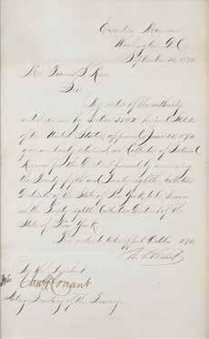 16. U. S. Grant Letter Signed as President, Retaining a New York Tax Collector. LS as president, one page, 8.25 x 13.5, September 25, 1875. Addressed from the Executive Mansion, an official letter to Francis S. Rew, in part: “By virtue of the authority vested in me by Section 3142 Revised Statutes of the United States, approved June 22, 1874, you are hereby retained as Collector of Internal Revenue for the District formed by annexing the Twenty-fifth and Twenty-eighth Collection Districts of the State of New York, to be known as the Twenty-eighth Collection District of the State of New York.” Neatly signed at the conclusion by President Grant, and countersigned by the Acting Secretary of the Treasury. In fine condition, with some light creasing. Starting Bid $200