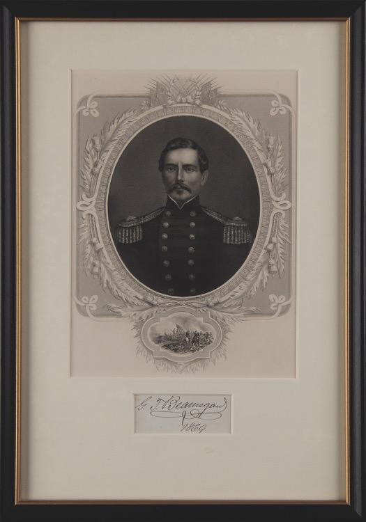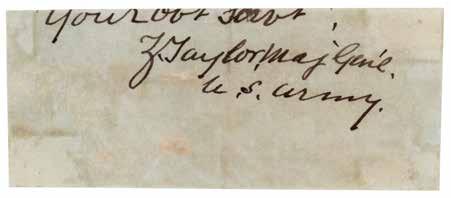 8. Zachary Taylor Signature. Ink signature, “Your ob’t serv’t, Z. Taylor, Maj. Gen’l, U.S. Army,” on an off-white 4.5 x 1.75 slip. In very good to fine condition, with irregular light staining and trimming affecting the first line of the closing. Accompanied by an engraved portrait bearing a facsimile signature. Starting Bid $200