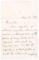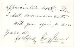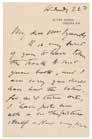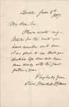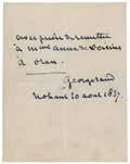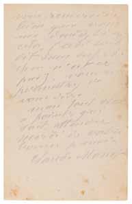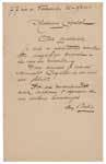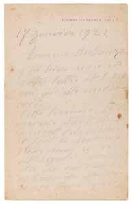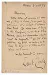 Autograph Letter Signed. ALS in French, one page, both sides, 5 x 6.75, Mesnil-Beaufresne (Oise) letterhead, October 20 (no year). Addressed from “Villa Primerose, Dinard,” a handwritten letter that alludes to some sort of disaster (translated): “I hope you were able to have your beloved ones close to you during the terrible events, at least you did not have to mourn any of your beloved ones. What a horrible time we are going through!” Cassatt then comments on a piece of furniture she wishes to ship from Paris to her sister in Philadelphia. In fine condition. Starting Bid $200