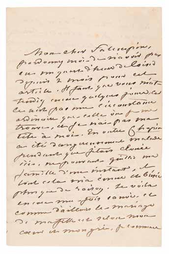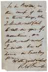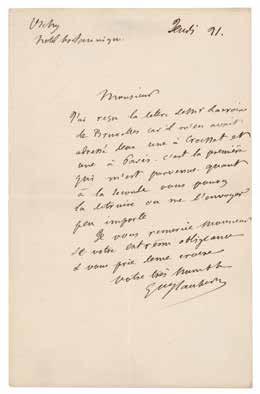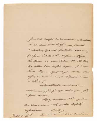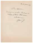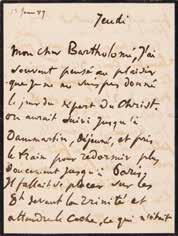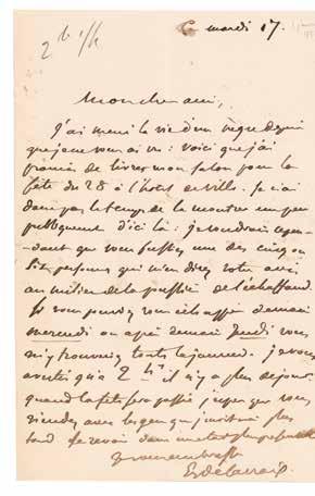6008. Eugene Delacroix Autograph Letter Signed. French artist (1798–1863) who takes a place in the first rank of painters in the Romantic tradition and whose mastery of color and technique inspired both the Impressionist and Symbolist schools. ALS in French, signed “Eug. Delacroix,” one page, 5.25 x 8, [January 17, 1854]. A handwritten letter from Eugene Delacroix to a friend, in full (translated): “I have led the life of a Negro since I saw you: here I have promised to have ready my exhibition room for the celebration on the 28th at the town hall. So I don’t have time to show it publicly until then: I would however like you to be one of the five or six people who will tell me your opinion of it in the middle of the dust of the scaffold. If you can escape tomorrow Wednesday or the day after tomorrow Thursday you will find me there all day. I warn you that at 2 a.m. there is no more daylight. When the party will be over I hope you will come with the people I will invite later to see it in a more presentable state.” In fine condition. Starting Bid $200