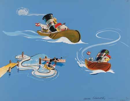 6014. Hardie Gramatky Original Painting for Weston Woods. American painter, writer, animator, and illustrator (1907–1979) best known for his children’s book Little Toot, the story of a young tugboat in New York Harbor. Original painting by Hardie Gramatky for Weston Woods Studios, accomplished in watercolor and gouache on 14 x 11 lightweight artist’s board, portraying three little tugboats in the water, signed along the bottom in ballpoint by the artist. In fine condition. Founded in 1953, Weston Woods Studios produced short films based on popular children’s books. Starting Bid $200
