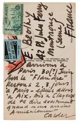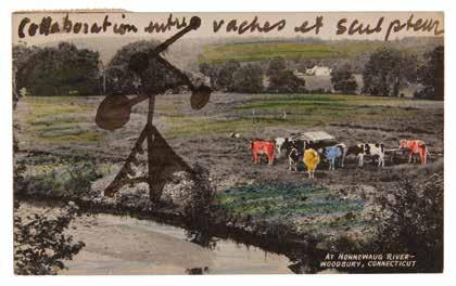 6003. Alexander Calder Signed Postcard with Mobile Sketch: “Collaboration between cows and sculptor”. American sculptor (1898–1976) known as the originator of the mobile. ALS in French, signed “Calder,” one page on a 5.5 x 3.5 postcard showing cows on the Nonnewaug River in Woodbury, Connecticut, May 9, 1958. Handwritten letter to “E. Beothy,” the Franco-Hungarian sculptor István Beöthy, in Montrouge (Seine), in which Calder announces arrival in Paris for the end of June. On the opposite side, Calder draws a sketch in the style of one of his kinetic sculpture mobiles, coloring in the cows and adding a caption across the top: “Collaboration entre vaches et sculpteur [Collaboration between cows and sculptor].” In fine condition.