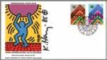 6015. Keith Haring Signed Postcard. Color semi-glossy 4.25 x 6 postcard of Keith Haring artwork from circa 1985 showing two figures holding up a large glowing red heart, signed within the heart in black felt tip, “K. Haring.” In very fine condition. Starting Bid $200