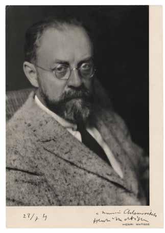 6017. Henri Matisse Signed Photograph. Rare vintage 8.5 x 12.25 paperstock book portrait of Matisse wearing his eyeglasses, dressed in a tie and tweed jacket, nicely signed and inscribed in the lower border in fountain pen, “A Monsieur Chlomoriten, Henri Matisse, 28/7 39.” In fine condition, with trimmed edges, and a short tear to the upper right border. Signed portraits of the great French visual artist are scarce in general, especially in this larger size—a marvelous piece. Starting Bid $300