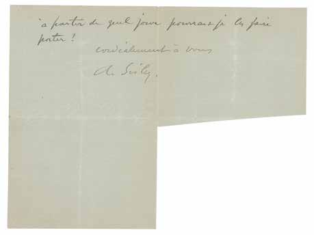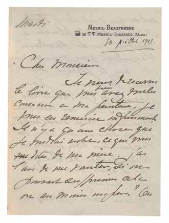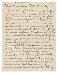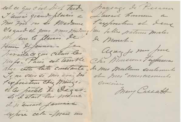 6004. Mary Cassatt Autograph Letter Signed, Referring to Works by Degas, Pissarro, and Monet. ALS in French, three pages on two adjoining sheets, 4.75 x 6.5, Mesnil-Beaufresne letterhead, July 30, [no year]. Handwritten letter to writer and art critic Achille Segard, in full (translated): “I have just received the book that you have kindly wished to devote to my painting. I am infinitely grateful to you for it. There is just one thing that I would wish to be otherwise, what you say about my mother. I sound as if I were boasting. Could that be suppressed, or at least a bit of it? Or is it too late? I would take great pleasure in seeing you here, if you and Mrs. Segard would give me the pleasure of coming to lunch. I am working, which calms the nerves. Paris is terrible, with that constant struggle. I don’t know whether you have seen the exhibition at Manzi’s and Degas’s pastels. If he had been there himself, he
