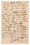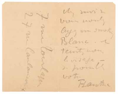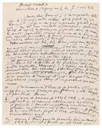 6010. Paul Gauguin Autograph Letter Signed from French Polynesia. ALS in French, one page, 7 x 9, no date (1898-1899). Handwritten letter to art dealer Ambrose Vollard, with Gauguin acknowledging his gift of 200 francs, adding with some irony (translated), “you think without being sure that you can send me 400 francs by the next mail.” Gauguin reminds Vollard that he had sent nothing in August and September, “which is a body-blow for me. The rainy season has started and in order not to sleep underwater I was obliged to have my entire hut re-roofed, so here I am with creditors to whom I had made promises and who think that I lied to them.” He is therefore forced to take on some accountancy jobs “which stupefy me. So you cause me some regrets that I did not deal with someone else. If you don’t have a strong enough constitution to advance me some money, you had better tell me.” In fine condition, with trivial paper loss to the upper left corner tip.