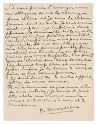 Signed - Rare Handwritten Letter from the Dutch Painter. Dutch painter and art theoretician (1872-1944) who is regarded as one of the greatest artists of the 20th century. He is known for being one of the pioneers of 20th-century abstract art, for his association with the De Stijl movement, and for his primary-colored geometric ‘Compositions.’ ALS signed “P. Mondrian,” one page both sides, 5.25 x 7, March 2, 1926. Handwritten letter to fellow artist Felix del Marle, director of the art journal Vouloir, in part (translated): “Yesterday I had finished my article which I wrote after your departure, inspired by what we had discussed and especially by what you and Madame had told me about my studio.” He asks for his French to be corrected, if necessary (“It doesn’t have to be beautiful French (on the contrary!) but it has to be correct”), and forwards two photographs, explaining that one has not been published: “It seems to me that it will be very good if you could make a plate on linoleum or wood; I have seen you do them. Such a large plate on zinc will also become too expensive and less beautiful.” He concludes: “‘I’ll be interested in what you say about my article; I believe it can be useful for the movement.” In fine condition. Starting Bid $200