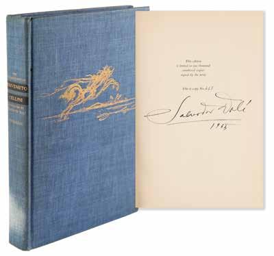 6006. Salvador Dali Signed Book - Autobiography of Benvenuto Cellini. Signed book: The Autobiography of Benvenuto Cellini, Illustrated by Salvador Dali. First edition, limited issue, numbered 668/1000. Garden City, NY: Doubleday, 1946. Hardcover, 7 x 9.75, 442 pages. Prominently signed on the colophon in fountain pen, “Salvador Dali, 1945.” Autographic condition: very fine. Book condition: VG-/None, with ex-library markings, a bookplate affixed to the front pastedown and circulation card holder torn from rear pastedown, embossed ownership stamps to half-title and title pages, and faded area to lower spine. Starting Bid $200