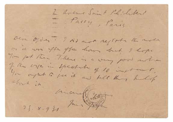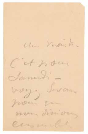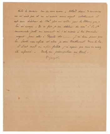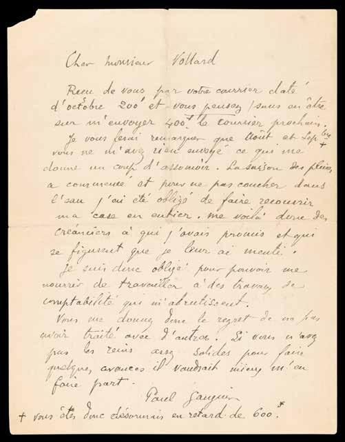 trap. After scandalous events in the Marquesas...a bandit judge under the orders of the governor...sentenced me...to 3 months in prison and a fine of 1000 F. I have to go on appeal to Tahiti. Travel stay and especially lawyer fees!! how much will this cost me? This is my ruin and the complete destruction of my health. It will be said all my life that I am condemned to fall, get up, fall again, etc. All my old energy goes away every day.” Gauguin writes more on the reverse, signing “P. Gauguin.” In part: “Vollard has not written to me for 3 letters and has not sent me any money...If he died or went bankrupt I hope you would have been informed. All these worries are killing me.” In fine condition. Starting Bid $2500
