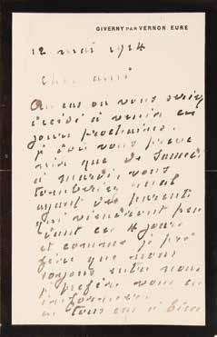 6023. Claude Monet Autograph Letter Signed. ALS in French, two pages, 5.25 x 8, black-bordered Giverny par Vernon letterhead, May 12, 1924. A handwritten letter from Claude Monet to a friend, in part (loosely translated): “In case you decide to come back another day I have to warn you that from Saturday to Tuesday, you would be experiencing bad weather, having some parents who will come during those 4 days and as I prefer when we are between us. I prefer to inform you anyway see you soon right let us hope that by then the weather improves.” In fine condition. Starting Bid $300