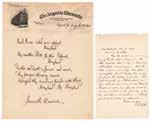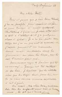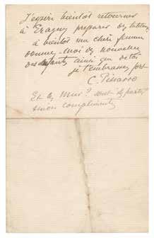 Joint Autograph Letters Signed. Wonderful joint pair of ALSs in French by Camille (“C. Pissarro”) and Lucien Pissarro (“Lucien”), three pages on two adjoining sheets, 5.5 x 8.5, both dated February 18, 1888, and addressed to their wife and mother, Julie Vellay. In Camille’s handwritten letter, which comprises the second and third pages, he informs his wife that he is sending her 300 francs and asks that she write to him as soon as possible. Lucien’s letter, which constitutes the first page, reads, in part: “I’ve been out of work for 15 days now, so I took the opportunity to draw a little and try to have some illustrations to do – I have to go and see if there’s anything to do at the studio tonight.” In fine condition. Starting Bid $200