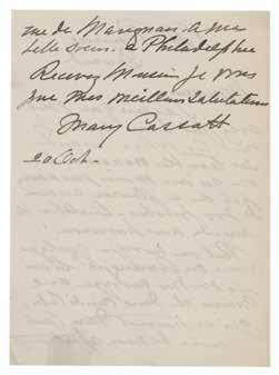 In 1913, Achille Segard published ‘Mary Cassatt: Un peintre des enfants et des mères,’ the earliest biography of the American painter, which was based on a series of interviews with her. In this exquisite letter, she refers to fellow painters Edgar Degas, Camille Pissarro, and Claude Monet. Of the three, she was closest to Degas, who served as one of her chief mentors in Paris. He invited her to exhibit in the third Impressionist exhibition in 1877, and introduced her to pastel and engraving. For her part, Cassatt was instrumental in helping Degas to sell his paintings and promote his reputation in America. Starting Bid $300