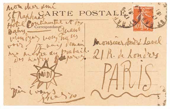 6025. Pablo Picasso Autograph Letter Signed with Sketch - Postcard to Andre Level. ALS in French, signed “Picasso,” one page on a 5.75 x 3.75 postcard, no date but postmarked August 17, 1919. Picasso writes to the art dealer, critic, and collector André Level in Paris, in part (translated): “My dear friend, Saint-Raphaël Continental Hotel and Baths—When will you come to see us? I will start working tomorrow. Gorgeous blacks.” Below, he draws a sketch of the noontime sun, with “Midi” at the center. The front of the postcard, titled “Souvenir de villégiature,” depicts a couple engaging in humorous dialogue. In fine condition.