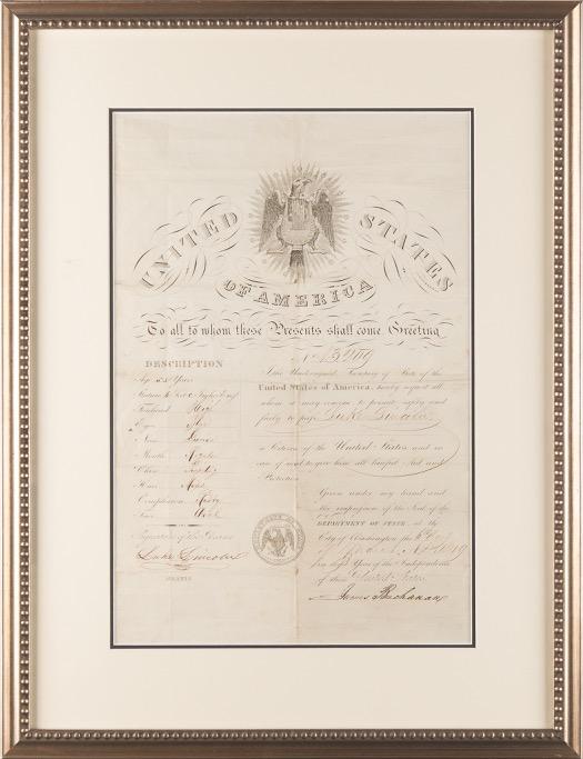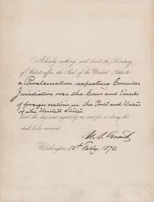 13. President U. S. Grant Signed Maritime Document on Consular Jurisdiction in American Waters. Partly-printed DS as president, one page, 8.5 x 11, February 10, 1870. President Grant authorizes and directs the Secretary of State to affix the Seal of the United States to “a Proclamation respecting Consular Jurisdiction over the Crews and Vessels of foreign nations in the Ports and Waters of the United States.” Boldly signed at the conclusion in ink by President U. S. Grant. In very good to fine condition, with light edge toning, and short fold splits.