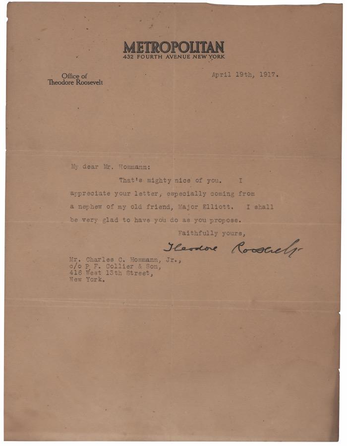 17. Theodore Roosevelt Typed Letter Signed. TLS, one page, 7.5 x 9.5, personal Metropolitan letterhead, February 23, 1917. Letter to Rev. Fraser Metzger of Bethany Church, in full: “Three cheers for you! I did not know what Colonel Reeves had done, but I want that regiment, and I want especially to have you. Personally, if I could do it, I would like to have in my division no one that was not whole, or in part, of German blood, as you and I are! I would like to show that we are Americans, and nothing else, and that we would serve against England, or Germany, or any other nation, if the interests of humanity, and the honor of the United States demanded that we should do so. I am very glad of that advice you gave the Governor. The Holy Alliance fiasco is an exact case in point. As you say, I think it is for us to work out our salvation, not merely to speak it out, or gesture it out. Three cheers for your final sentence! By George, you are an American of the kind that is dear to my soul.” Matted to a slightly larger size and in very good to fine condition, with some toning and corner mounting remnants matted out. Starting Bid $300
