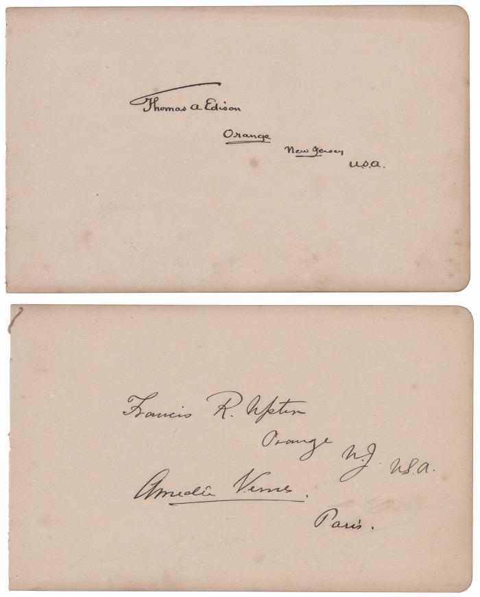 18. Theodore Roosevelt Signed Book - Through the Brazilian Wilderness (First Edition). Signed book: Through the Brazilian Wilderness. First edition. NY: Charles Scribner’s Sons, 1914. Hardcover, 6.75 x 9.75, 383 pages, with supplemental map of Brazil. Signed and inscribed on the first free end page in bold ink, “To T. H. Powers Farr, from his old friend, Theodore Roosevelt.” Autographic condition: fine. Book condition: VG/None, with some sunning to spine, rubbing to boards, and a “Library of Lawrence E. Miller” blindstamp to the last page. A popular book in which Roosevelt chronicles his 1913 expedition into the Brazilian jungle as a member of the Roosevelt-Rondon Scientific Expedition. Accompanied by the visitor’s card of poet and lecturer Corinne Roosevelt Robinson, “Mrs. Douglas Robinson,” the younger sister of Theodore Roosevelt and an aunt of Eleanor Roosevelt. Robinson has signed and inscribed the card in fountain pen, “For Mr. Farr, with all kind wishes from, C. R. R.” Starting Bid $200